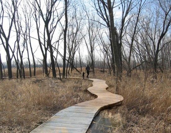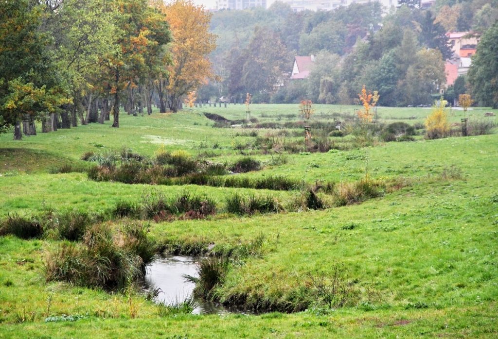 V místě, kde je kolem potoka velký prostor, navrhujeme potok zmeandrovat, vytvořit zasakovací plochy, určitou formu potenciálního mokřadu s příslušnou vegetací. Potoku i mokřadním plochám pomůže, když bude veškerá dešťová voda z povrchů sváděna směrem k nim. Přes takto rozvolněný potok by mohly vést dřevěné lávky až do suchých částí zeleně. Předpokládáme také doplnění stromů a drobných prvků mobiliáře – lávky z masivu. Vytváříme nejen rozmanité prostředí pro život zvířat a lokálních druhů rostlin. Na jednom místě se přirozeně objeví vodní vlhkomilné rostliny a živočichové. Koryto potoka na několika místech překračujeme lávkou a doplňujeme zde sezení a herní prvky pro děti.