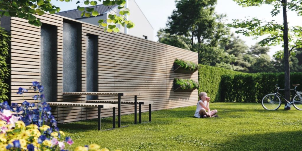 Mezi bytovkami poblíž školy doplňujeme dřevěný mobiliář a listnaté stromy. Předzahrady by zjemnily a zosobnily bezprostřední okolí budov.