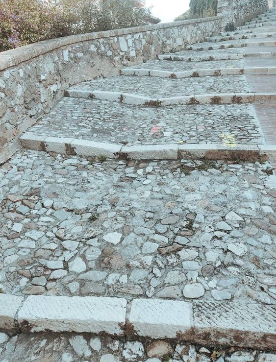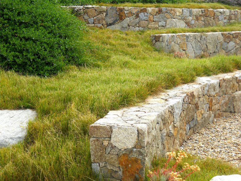 Propojení podél svahu dláždíme kamennou štětovou dlažbou. Nástup mezi jednotlivé terasy je tvořen schody, na něž dále navazují mlatové pěšiny.