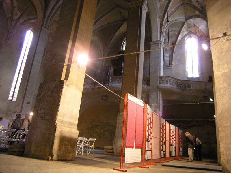 Průhled uličkou ke kostelu. Zeď slouží jako výstavní plocha. Změna povrchu může být součástí další fáze proměny místa.