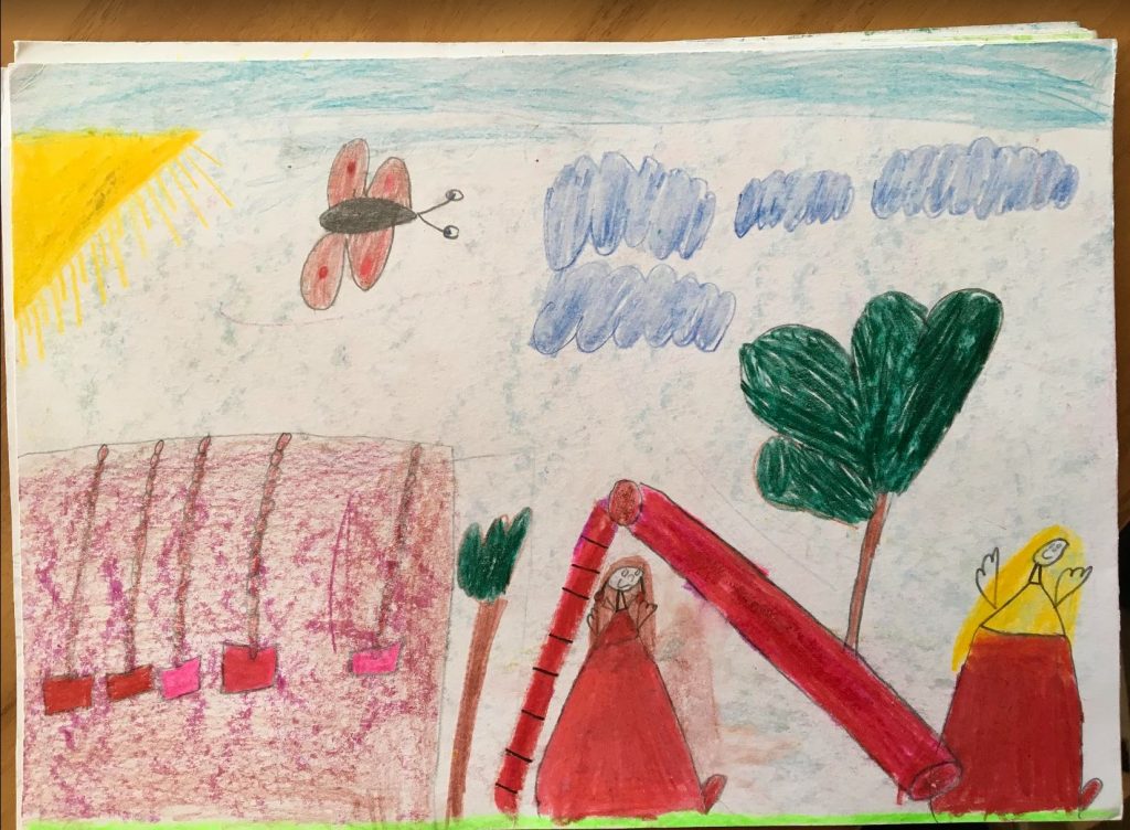 Rádi bychom pozemek zkultivovali také trvalkovými záhony, do jejichž tvorby by se mohly zapojit děti samotné. Jako důležité vidíme propojení k Daníži, k navrhovaným meandrům potoka. Kontejnery v uličce u školy přemisťujeme do přístřešku, který je zakryje a vytvoří clonu proti slunci, aby se v létě nerozehřívaly. Zároveň bychom doporučili jehličnany v uličce nahradit lokálními listnatými stromy. Předprostor školy by mohl být dlážděn šatovkou. Navrhujeme umístit větší solitérní listnatý strom, v jeho stínu potom sedací prvky, ke zvážení je také nějaká zajímavá dřevěná socha.