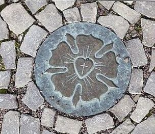 Vstup do uličky z parku je vyznačen symbolem vína, který je začleněný do kamenné štětové dlažby.